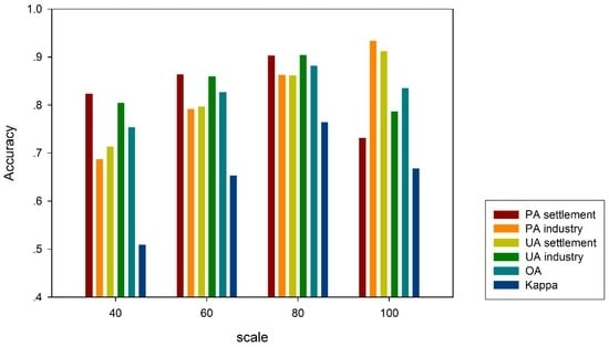 To analyze scale effect of landscape unit, Table 3 showed the classification accuracies for 40 m, 60 m, 80 m, and 100 m chessboard scales. A histogram of classification accuracies for both types of settlement and industry in all these different scales is provided in Figure 7. This figure presents producer’s accuracy (PA), user’s accuracy (UA), overall accuracies (OA) and kappa coefficient to enable direct assessment of the differences between classification results from individual scale.