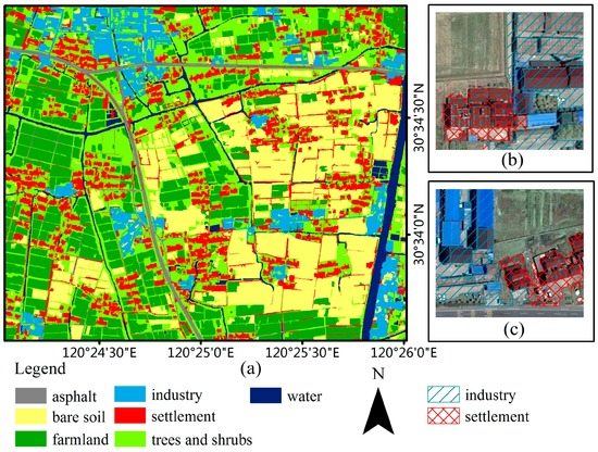 Final classification map for the whole study area (a) at scale 80 m, and some subset example presented the mix situation that there are no clear boundaries between industry and settlement area, and the approach proposed discriminated this two area successfully (b,c).