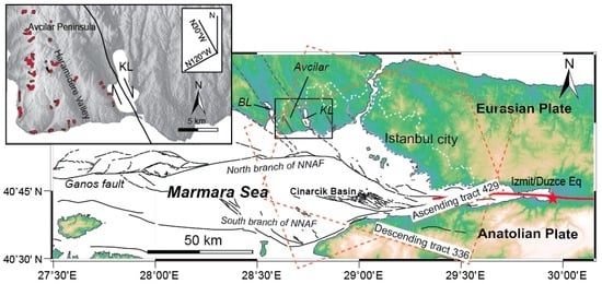 The 1999 İzmit/Düzce earthquake disaster highlighted the high seismic hazard and revealed a westward propagation of earthquakes towards the Marmara Sea []. The tectonic evolution of the NNAF beneath the Marmara Sea has been widely discussed in past decades; some authors suggest that the NNAF deforms as a single shear zone [], whereas others suggest that the crust beneath the Marmara Sea is separated by an E-W trending graben []. Besides, the evolution of the NNAF zone has also been interpreted as a combination of en-echelon strike-slip faults and pull-apart basins [,,] associated with numerous subparallel fault scarps of unknown activity [,]. These investigations mostly focused on the fault activity beneath the Marmara Sea, but the possible activity of secondary faults north of the Marmara Sea remained to be studied. As the faults are shaping the land and directly affect the populated regions of western Istanbul, monitoring the fault activity in this region is of great importance.