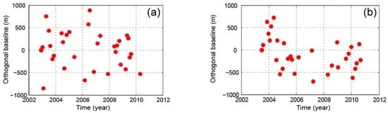 For each dataset, the interferograms with respect to the first image of the series were generated (single master interferogram configuration). In fact, when working at full resolution with PSI techniques, there is no added information in the other interferograms (all the possible pairs can be exactly obtained as a linear combination of the single master interferograms). Persistent scatterers are by definition quite insensitive to spatial and spectral decorrelation effects, and large temporal and spatial baseline interferograms can be used, allowing the full exploitation of long time series of acquisitions. The diagrams of the temporal and spatial distribution of SAR images corresponding to the two analyzed datasets are shown in Figure 2.