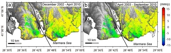 - Akarvardar, S.; Feigl, K.L.; Ergintav, S. Ground deformation in an area later damaged by an earthquake: Monitoring the Avcilar district of Istanbul, Turkey, by satellite radar interferometry 1992–1999. Geophys. J. Int. 2009, 178, 976–988. [Google Scholar] [CrossRef]