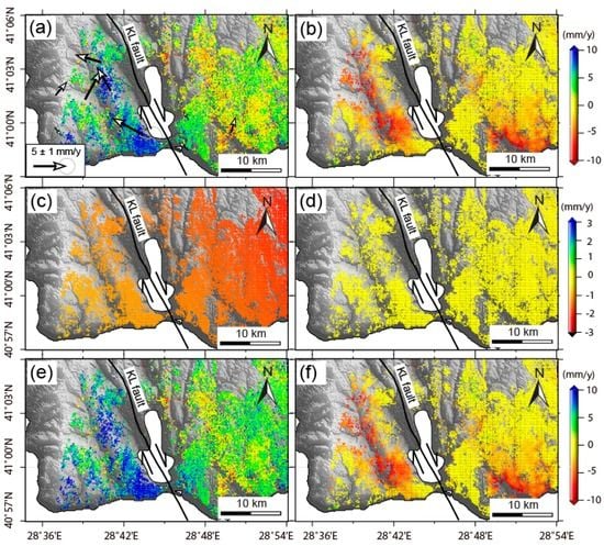 Decomposed InSAR velocity in the horizontal (positive means that points move along N30°W) (a) and the vertical direction (b); (c,d) are the horizontal (N30°W) and vertical crustal velocity that was induced by the post-seismic viscoelastic relaxation of the 1999 İzmit/Düzce earthquakes; (e,f) are fault-parallel and vertical velocity after removing the post-seismic viscoelastic relaxation effect of the İzmit/Düzce earthquakes; black arrows in (a) show GPS velocity in this area [].