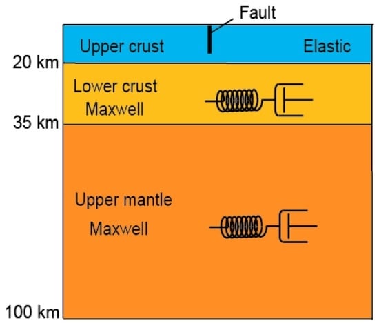 Secondly, the lower crust and upper mantle viscosity of the Maxwell rheology play an important role in estimating the PVRE effect []. These parameters were inferred from the post-seismic GPS observation in a similar time period by employing a grid-search method [].
