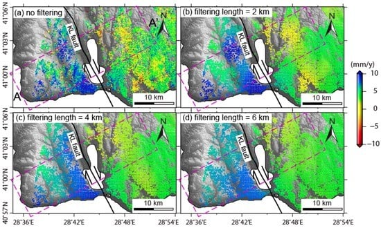 Horizontal velocity field along N30°W near KL: (a) Without spatial filtering; (b–d) Filtered data with different spatial filtering length. Purple boxes show the location of the velocity profile (A–A’) shown in Figure 7.
