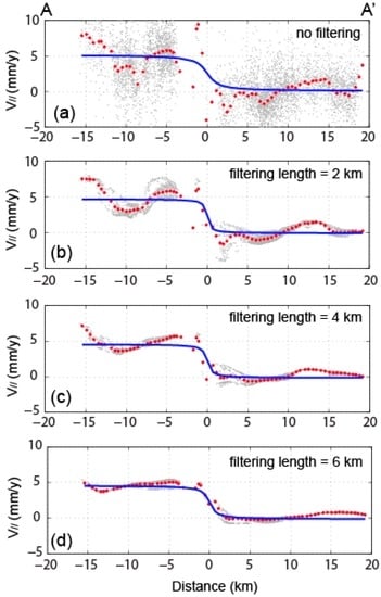 Decomposed horizontal velocity (N30°W) on profiles perpendicular to the orientation of the fault and comparisons to the model predictions that were inferred from the optimal fault parameters: (a) Original fault-parallel velocity without spatial filtering; (b–d) Velocity profiles obtained from low-pass filtered data. The blue lines in each subfigure are the forward predictions based on the inverted optimal fault parameters. In each subfigure, the gray dots show the original or filtered data along the profile, and the red dots represent the mean values at each distance along the profile. The location of this profile is shown in Figure 6.