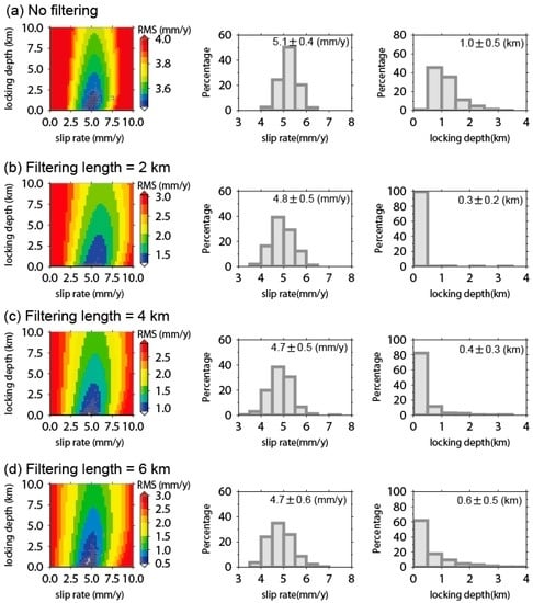 Inversion results: the first column shows the slip rate versus fault locking depth; the second and third columns reveal the statistic distribution of the slip rate and locking depth inferred from each velocity profile. In the first column, the black circles represent the optimal solution inferred from 500 Monte Carlo simulations. (a) Shows the result that was inferred from the original data; (b–d) show the results that were inverted from filtered data with filtering length of 2 km, 4 km and 6 km respectively.