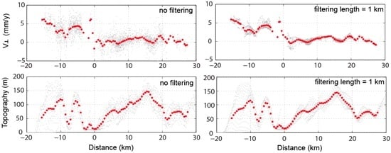 Decomposed horizontal velocity (in the N120°W direction) on the profile and comparisons with the topography. The first column shows unfiltered data, while the second column shows the data filtered with a filtering length of 1 km. In each subfigure, the gray dots show the original data along the profile, and the red dots represent the mean values at each distance along the profile. The location of the profile is shown in Figure 6.