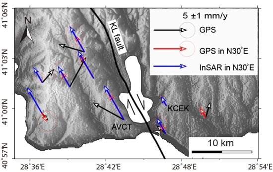 Near-field geodetic observations can provide an independent constraint on the present activity of these secondary faults. Recent GPS observations show local crust deformation (~5 mm/year) near KL [,], however, the inferred results may suffer from the spatial limitation of the survey-mode GPS observation. Previous studies [,] already described the pronounced subsidence of the Avcilar area (Figure 1), but the horizontal movement related to the secondary fault activity remained to be studied.