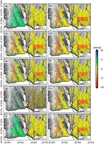 Thirdly, we added noise to the generated LOS velocities (Figure A2e,f). A Gaussian noise with a standard deviation of 2 mm/year was used here.