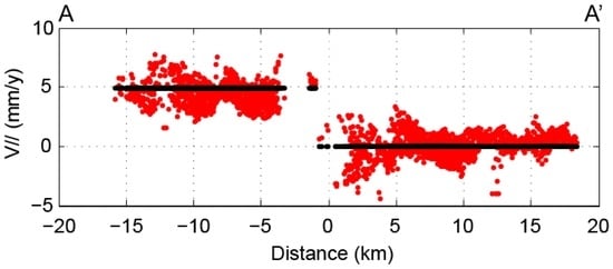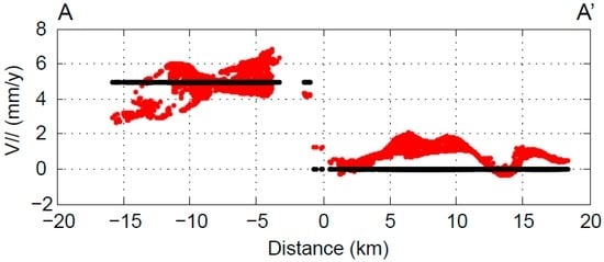 After removing the PVRE, a velocity profile perpendicular to the fault orientation was constructed (Figure 7), which was used to estimate the fault slip rate and locking depth based on a widely-used 2D screw dislocation model []. In this model, the fault-parallel velocity () as a function of its perpendicular distance to the fault () can be drawn by: