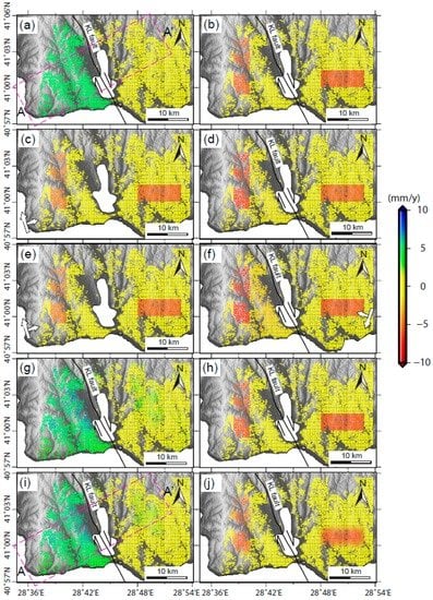 Spaceborne SAR interferometry (InSAR) allows investigating the study area at high resolution and identifying subtle deformation occurrences. The basic principles of SAR interferometry have been extensively described in the literature [,], and the techniques were then significantly improved by the application of time series procedures. The small baseline subset technique [] allows such time series analysis and is based on interferograms with small baselines to limit geometric decorrelation and was used to map subsidence zones in the Avcilar area nearby Istanbul []. The PSI technique, with the idea of selecting distinct pixels, named persistent scatterers (PS), characterized by a coherent signal over a long series of acquisitions, irrespective of the baseline, brought important advances in the field, allowing millimetric precision of displacement detection []. Since then, different PSI and, in general, multi-interferogram InSAR techniques have been developed [,,,,,]. By means of PSI techniques, very long time series, such as available over the study area west of Istanbul, can be processed, and very dense PS measurements can be obtained in spite of temporal and geometrical decorrelation effects.