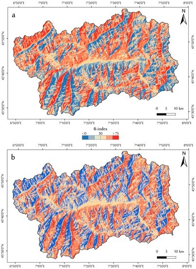 By assuming ERS-1/2 and ASAR-Envisat acquisitions, we aim at understanding the theoretical distribution of scatters in the VDA region. This analysis has been carried out by computing the R-Index [82], which considers slope and aspect angles of the ground surface, as well as the satellite’s incident acquisition geometry (incident angle, i.e., 23°, and an azimuth angle of the satellite orbit from north (clockwise), i.e., 345° in ascending orbit and 195° in descending orbit, respectively). The resulting map reveals, for the north–south oriented valleys, layover (thus less exploitable scatters) on the west-facing slope in ascending orbit (Figure 2a) and layover on the east-facing slope in descending orbit (Figure 2b). On the other end, east–west oriented valleys experience layover or foreshortening on the north-facing slopes in ascending orbit and the south-facing slope in descending orbit.