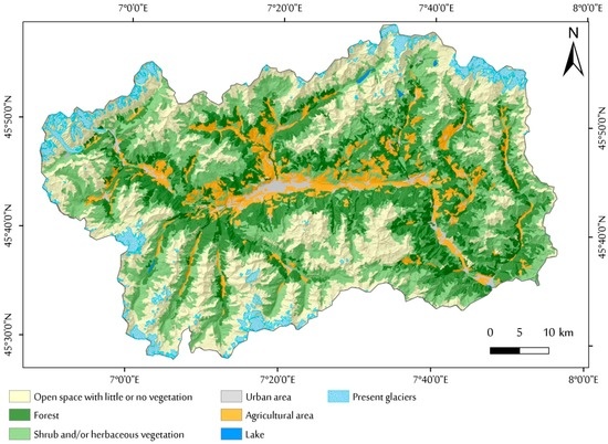 As typical in alpine valleys, VDA has a prevalence of highly vegetated areas, while human settlement distribution is located at the valley bottom. The land cover is prevalently represented by forest, natural grassland, and rock outcrops with little or no vegetation. In addition, the massifs dominating the VDA landscape act as morphological boundaries and deeply influence the local climatic conditions. Indeed, the high peaks limit the access of air masses from the Mediterranean Sea or the Atlantic Ocean, causing a clear difference in the rain and snow precipitation regimes [61]. The regional climate, in mountainous and marginal sector, is characterized by wide range of temperatures and rainfall/snowfall (min, max and average values of 1000–1100 mm/year, while, in correspondence of the principal valley bottom, by a temperate climate, characterized by relatively lower rainfall (lower than 600 mm/year) [62].