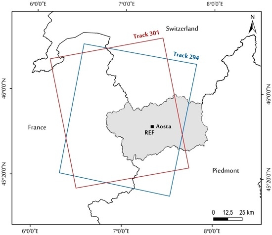 We consider SAR images collected by ERS-1/2, in ascending orbit, and ASAR Envisat missions from ascending and descending orbits (see Table 1). The tracks cover most of the VDA regional territory, excluding only about 10% of the entire region localized in the eastern portion (see Figure 4). The reference point is selected corresponding to an area assumed stable, on the basis of geological and geomorphological background analysis, during the investigation period, and where DInSAR coherence values are expected to be high (i.e., within the Aosta municipality, see Figure 4).