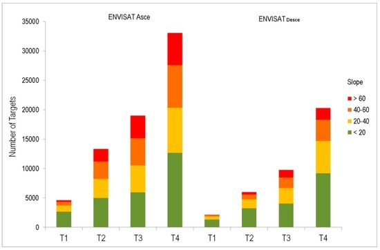By exploiting the GPOD-SBAS, we obtained mean deformation velocity maps and displacement time series for the VDA regional territory, covering a time interval of more than 4 years (ERS-1/2) and of more than 6 years (ASAR-Envisat), respectively (see also Figure S1). Table 2 summarizes the testing activity done to perform the iterative procedure implemented for the high mountain region, operating on the Envisat dataset, and later directly applied to the ERS-1/2 dataset. All of the processed tasks were successfully completed by the unsupervised GPOD-SBAS service in less than 24 h. Depending on the SAR images considered, and on the processing parameters applied, we obtained a different amount of coherent targets (see Table 2). In Figure 5, we show the distribution of coherent targets subdivided according to slope class, obtained by the slope calculation from a DTM with 10 m square grid spacing for each processed task of the Envisat datasets. We note that, for all the datasets, we have a general increase in the number of coherent targets for all slope classes. In the first task T1, the prevalent distribution corresponds to the lowest degree slope (0°–20°), coincident to the most urbanized areas, corresponding to the most coherent sectors. On the contrary, on the high to very high classes (40°–60° and >60°), we note a general lack of target distribution. However, the number of targets obtained in T4 is as large as one order of magnitude with respect to T1.