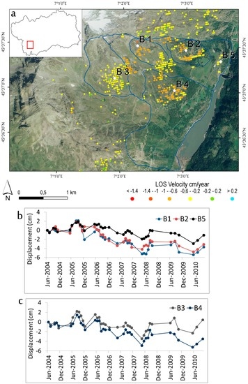 Analyzing the ground deformation time series available for several targets within the phenomenon, we observe a substantially constant deformation rate, represented by a linear trend; however, several accelerations, related to the later spring–summer period, are observed. Specifically, five targets distributed within different Beauregard domains, are presented (Figure 8b,c). The higher displacement of −3.7 cm (away from the satellite), for the observed period from June 2004 and October 2010, was registered by the target B1 located in correspondence to the main scarp of the DsGSD, while the target B5 located in correspondence to the toe of the DsGSD, close to the dam, registered a maximum displacement of −1.07 cm. Instead, a displacement comparable to what was observed for the B1 target, is registered by target B4, with a maximum of −3.5 cm.