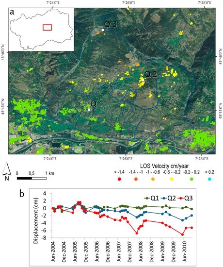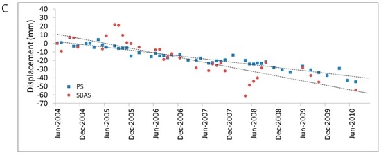 For these two cases, the analysis of the ground deformation time series of the targets (Figure 10b) reveals a constant deformation rate, with a maximum displacement of −1.4 cm for the observed period from September 2004 to October 2010. Analyzing the time series in detail, they seem to display a sort of acceleration in correspondence to the summer and the mid-autumn (e.g., summer 2009). It is worth noting that such phenomena present a seasonal fluctuation [68], where the highest velocities appear during the summer to early autumn months; looking at the results from year to year, comparing the late summer with respect to the early subsequent summer, a moderate acceleration can be observed.