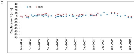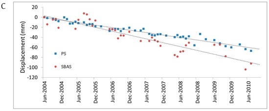 Advanced DInSAR methods have been developed to derive ground velocity maps and displacement time series [33,34,35]. The small baseline subset (SBAS) technique [34], which combines sets of interferograms with small orbital separation (baseline) and short revisiting time to reduce the temporal decorrelation and maximize the number of coherent SAR targets, has proven to be suitable in different deformation scenarios [36,37,38,39]. Accuracies are in the order of 1 mm/year for mean surface velocities and 5 mm for displacement measurements [40].