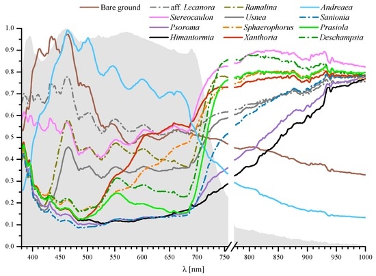 - Rees, W.; Tutubalina, O.; Golubeva, E. Reflectance spectra of subarctic lichens between 400 and 2400 nm. Remote Sens. Environ. 2004, 90, 281–292. [Google Scholar] [CrossRef]