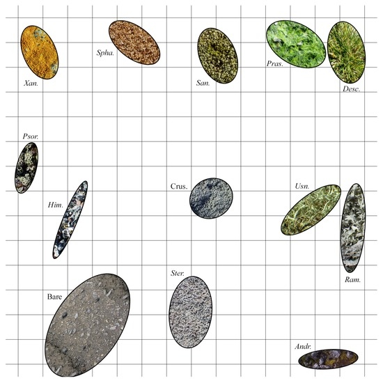 The PCA-LDA results were coherent with the SOM mapping of the spectra to a 2D manifold, see Figure 4. The ellipses represent two-dimensional Gaussian fits () to the sample set of each cover class in the 2D manifold. The inherent topology-preserving nature of the SOM allows to visualize the relationships between classes. In the resulting mapping, bare ground on one corner and tightly close Deschampsia and Prasiola on the opposite “green” corner clearly represent two extremes. The other two opposite corners were occupied by the “orange” Xanthoria on one side and the Andreaea moss on the other. Close to bare ground were the crustose lichen aff. Lecanora and Stereocaulon on one side, and Himantormia and Psoroma on the other. Halfway between the Andreaea corner and the “green” corner were the lichens Ramalina and Usnea, close to each other. Last, Sphaerophorus and Sanionia were located between the “orange” corner and the “green” corner, with Sanionia midway between Prasiola and Sphaerophorus. In spite of the fundamentally different nature of the analytical procedures involved in PCA-LDA and in SOM mapping, all these spatial relationships derived from the SOM, regarding relative positions, proximity and neighbourhood relations, showed a good match with the PCA-LDA results in Table 3 and Table 4.