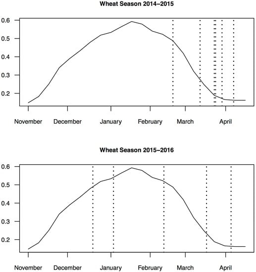During the 2014–2015 growing season, six dates of mostly cloud-free imagery were acquired: 18 February, 11 March, 22 March, 23 March, 28 March, and 6 April. For the 2015–2016 growing season, five dates of mostly cloud-free imagery were acquired: 21 December, 3 January, 11 February, 16 March, and 4 April. We did not task specific image dates, and instead Terra Bella collected images depending on satellite availability, averaging approximately one image every two to three weeks. Imagery was not obtained during the first half of the wheat growing season in 2014–2015, but spanned the entire growing season in 2015–2016 (Figure 2). Terra Bella’s SkySat satellites collect optical multi-spectral imagery at 2-m resolution, which includes blue (0.450–0.515 nm), green (0.515–0.595 nm), red (0.605–0.695 nm), and near infra-red (0.740–0.900 nm) bands.