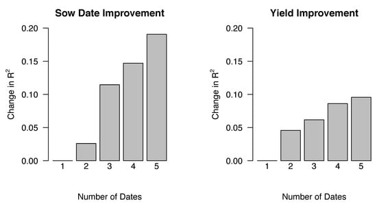 We developed linear models that used all possible image dates. This is because our analyses suggested that models that used all image dates had the highest R2 for both yield and sow date predictions (see Results, Section 7). However, for crop model parameterized models, we restricted our analysis to only include images before mid-March. This is because wheat phenologies in our crop model simulations matured and senesced one month earlier than observed phenologies, resulting in a mismatch between our observed and crop model phenologies after mid-March. This mismatch has been well documented in previous studies [], especially for late sown wheat in north-western India, and this has been identified as a weakness in the APSIM model and an important area for future research [].