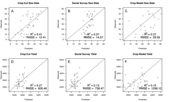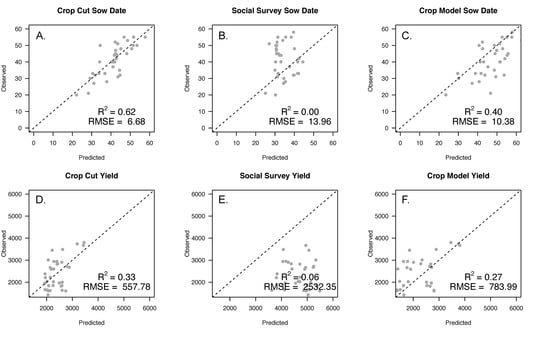 Sow date and yield prediction accuracies using 2015–2016 imagery. Predicted versus observed sow dates using: the crop cut parameterized model (A); the self-report parameterized model (B); and the crop model parameterized model (C). Predicted versus observed yields using: the crop cut parameterized model (D); the self-report parameterized model (E); and the crop model parameterized model (F). The one to one line is highlighted with a dashed line, and R2 and RMSE for each analysis are reported.