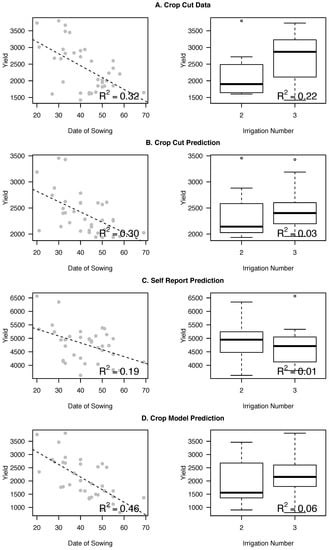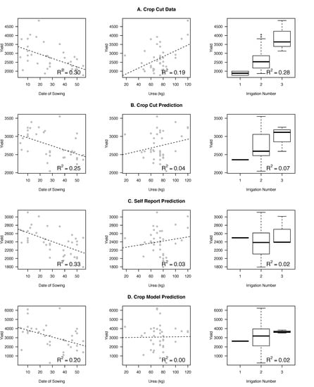The relationship between yields and sow date, urea fertilizer added, and number of irrigations for 2014–2015 data: (A) known relationships between these management variables and yield as measured using the crop cut yield data collected in the field; (B) relationships with yield estimates using the crop cut parameterized model; (C) relationships with yield estimates using the self-report model; and (D) relationships with yield estimates using the crop model parameterized model. R2 between management variables and yield are highlighted in each graph.