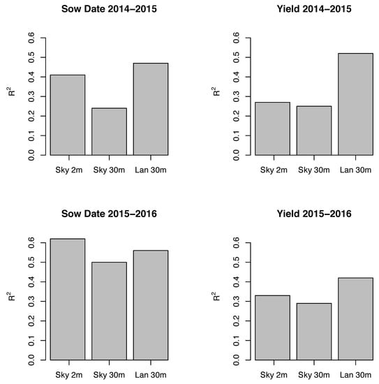 R2 for all-date models predicting sow date (A) and yield (B) in 2014–2015 and sow date (C) and yield (D) in 2015–2016 using either the original SkySat data (Sky 2 m), SkySat data resampled to 30 m (Sky 30 m), or Landsat data (Lan 30 m). Five images are used for all SkySat analyses, while seven are used for Landsat analyses.