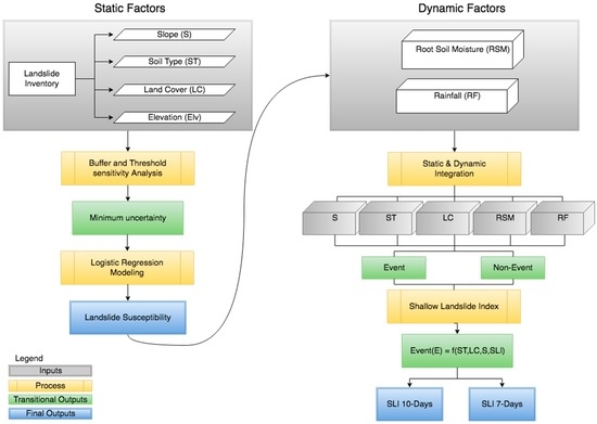 Shallow Landslide Index (SLI) Workflow. (Left) static factors and methods used to establish susceptibility; (Right) Dynamic and static factors integration to determine what combination results in a shallow landslide event. Such combination is expressed in the form of an index calculated for 10 or 7 days of root-soil moisture and rainfall conditions.