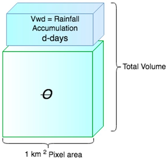where Vw represents the volume of soil moisture content in the pixel area, V the total volume of the pixel area and where Vwd is the rainfall volume of water added in d-days preceding the shallow landslide event. Figure 2 below shows the conceptual rainfall accumulation and antecedent soil moisture model.