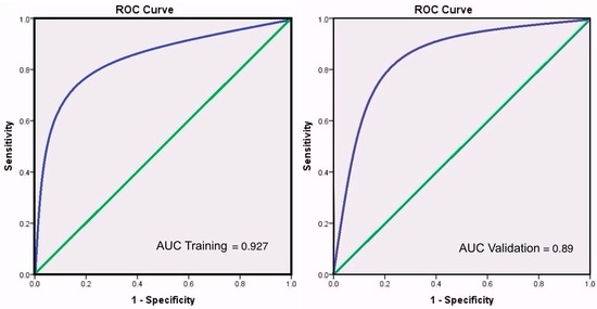 The AUC, as a measure of model performance, presents the trade-off between true and false positive proportions. Here, the AUC represents accuracy without sensitivity to changes in class distribution. The resulting AUC for the 0.5 cut-off value is 0.927 for the training set and 0.89 for the validation set, hence, the 0.5 cut-off value is the selected threshold for the event and non-event decision. Figure 4 below shows the AUC curves for the training and the validation datasets.