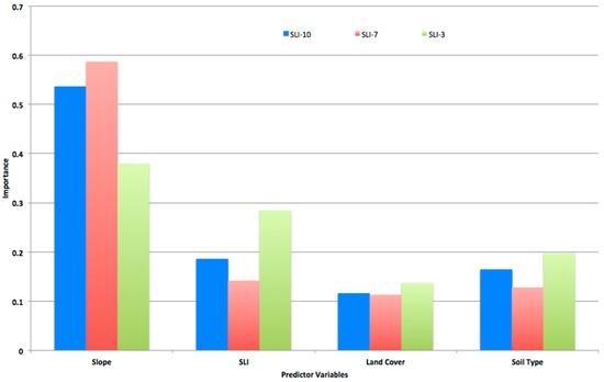 - Slope is the variable with most influence over the model followed by soil moisture content and rainfall in the form of SLI, soil type, and land cover are subsequently in importance in the three models.