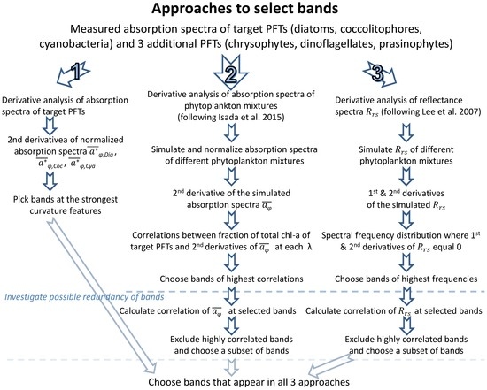 Three different methods (described below) were applied to examine the placement of spectral bands to retrieve different PFTs. The flowchart of the consecutive steps involved in this process is shown in Figure 1.