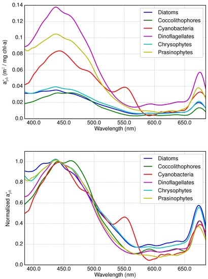 Figure 2 (top panel) shows the original measured chlorophyll a (chl-a) specific absorption spectra of diatoms, coccolithophores, cyanobacteria, dinoflagellates, chrysophytes and prasinophytes (, , , , , ). The corresponding spectra normalized to are presented in Figure 2 (bottom panel) (, , , , , ).