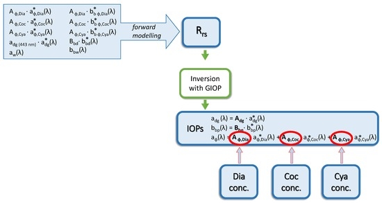 Remote sensing reflectances () were simulated in a simplified manner using an ocean reflectance model, which is also commonly used in its inverse form for retrieving inherent optical properties (IOPs) from measured . We adopted a form of an ocean reflectance inversion model that follows that described by and utilized in the generalized IOP (GIOP) model software [19]. The code of the GIOP model was adapted to include the absorption and backscattering spectra of three target PFTs. While we recognize that such an ocean reflectance model (ORM) has been utilized elsewhere, we will refer to it as GIOP throughout the remainder of this manuscript for convenience. The following steps illustrate the set-up of this forward modeling.