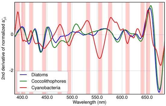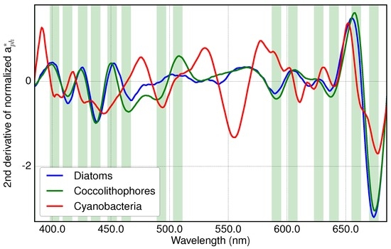 Here, we adapted their approach and applied it to simulated data (Figure 1). Different from the previous approach (Section 2.3), where we directly calculated the derivatives of the specific absorption spectra of the target PFTs, here we analyzed the absorption spectra of mixed phytoplankton communities. Phytoplankton absorption of different communities was calculated for the combinations of seven different concentrations (0, 0.01, 0.05, 0.1, 0.5, 1, 5 mg·m) of the three target and three non-target PFTs (117,649 scenarios), as the sum of the specific absorption spectra of each PFT multiplied by its concentration (the number of different concentrations is smaller here because of including three additional PFTs, which radically increases the number of scenarios). The spectra were then smoothed with a mean filter window of 9 nm (following [5] and [31]) and normalized to the absorption at 443 nm. Afterwards, second derivatives of the spectra were computed, following Equation (11).