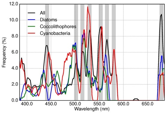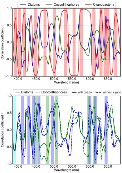 In Figure 5, we highlighted the bands that were chosen separately for cyanobacteria (top panel) and diatoms and coccolithophores (bottom panel). In the previous approach (Section 3.1), bands were simultaneously chosen for diatoms and coccolithophores, since their spectral features were not well separated.