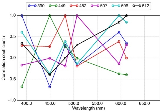 Correlation coefficients of normalized absorption coefficients of simulated mixtures () at wavelengths chosen for coccolithophores (highest correlation of second derivatives of at these wavelengths and chl-a concentration of coccolithophores); at each band indicated in the legend was used as the independent variable, respectively, while at other bands was considered as the dependent variable. A correlation coefficient for linear regression was then calculated for each pair.
