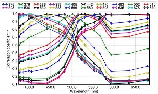 The possible redundancy of bands was also investigated similarly to Section 3.2, by calculating correlation coefficients among the chosen bands for (e.g., as shown in Figure 9 for a 10-nm smoothing window). From groups of bands that were highly correlated, only one band was chosen (for example, from bands at wavelengths of 376 nm, 379 nm and 386 nm, the band of 379 nm was chosen). The chosen bands for 10-nm resolution, before and after excluding highly correlated ones, are given in Table 1 as ‘Freq. 10 nm’ and ‘Freq. 10 nm red.’, respectively.