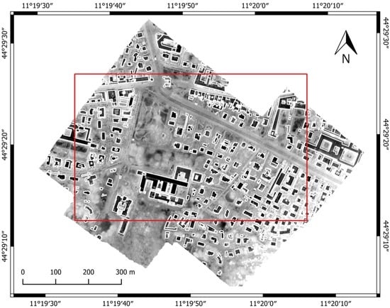 Twenty-one frames from three adjacent strips covering the test area were mosaicked and orthorectified (Figure 1) using 60 ground control points, whose coordinates were derived from the technical cartography of the Municipality of Bologna (nominal scale: 1:2000). The processing was carried out using Agisoft Photoscan™, a software based on the “structure from motion” technique [29] that can reconstruct the three-dimensional morphology of a scene when provided with bi-dimensional overlapping frames acquired by terrestrial or aerial digital cameras.