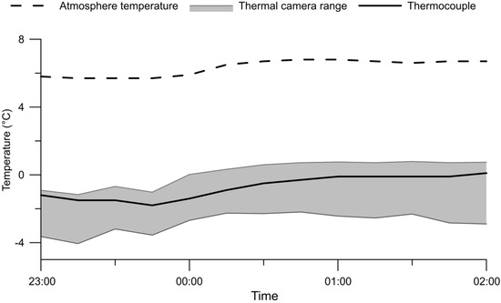 In order to evaluate the homogeneity of the surface temperature on roofs and, consequently, the representativeness of the punctual temperature measurements derived from the thermocouples, a specific survey was made during the same night of the infrared aerial acquisition. Another FLIR P620 thermal camera was installed on the roof of the School of Engineering and Architecture, in a fixed position and with a reflective covering to protect it from the solar radiation. The camera was placed on top of a high tripod (about seven meters above the roof level), and it registered images of the portion of the tilted roof covered with a sheath slated where the TC02 thermocouple was placed, with a sampling period of 15 min. These images allowed the determination of emissivity and temperature, according to the same procedure used for the other sites. The comparison between the registered temperatures is shown in Figure 2.