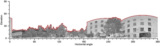 An automatic routine was developed in IDL™ to process the point clouds. Firstly, point coordinates, which were expressed in a local Cartesian system centered on the instruments, were translated upward to accommodate for the height of the origin of the scanner system from the ground; this translation is the sum of the vertical offset of the instrumental center from its base (determined in the laboratory by means of topographical measurements) and, when used, the height of the tripod. Then, the coordinates were expressed in a spherical system centered on the observation point. Both azimuthal and polar directions were divided in steps by 0.1 degrees. For each angular step, the echo from the closest object was identified, and its range and amplitude were stored in an array. This way, it is possible to reconstruct a 2D view (azimuth and elevation) of the obstacles visible all around each point and, therefore, determine their maximum elevation as a function of the azimuthal direction. This function () was used to solve Equations (7). Isolated pixels in the 2D view were removed as they may originate from incidental echoes caused by flying birds or instrumental noises. An example is shown in Figure 4.