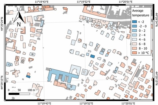 An example of the possible outputs of the proposed procedure is shown in Figure 7. The surface temperature map obtained from aerial images was imported in a GIS environment and coupled with the numerical cartography. The average temperature of roofs was therefore calculated and assigned as an attribute to the building entities.