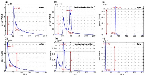 While the land-like waveforms exhibit a strong single peak with high power (), the water-like waveforms conform to ocean-like waveforms with significantly smaller power (). The waveforms at the land-water transition contain multiple peaks with medium power (). The width of the waveforms over land is very small (), it gets larger for waveforms over water () and waveforms at the land-water transition show the largest widths (). Furthermore, the COG of the shifted waveforms over land is significantly smaller () than the COG of the shifted waveforms over water () and the shifted waveforms at the land-water transition ().