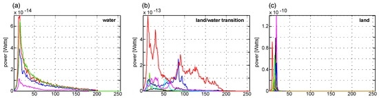 Shape of the shifted waveforms of the thirty clusters which are assigned into the three classes: (a) water (includes 4 clusters); (b) land-water transition (includes 6 clusters) and (c) land (includes 20 clusters).