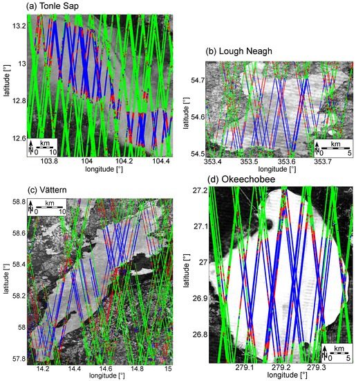 Table 2 also shows the number of tracks over each lakes as well as the used data points for validation. One can see that for the three largest lakes (>1500 km) nearly all tracks crossing the lake can be processed. This holds not for Lake Neagh where only about 80% of the tracks are usable—even if waveforms classified as “land-water transition“ are exploited.