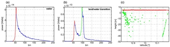 (a) An unscaled waveform over water and (b) an unscaled waveform at the land-water transition. The “best” sub-waveform is marked in red and the other sub-waveforms are marked in green. Plot (c) shows surface heights obtained from all sub-waveforms (green) and the “best” sub-waveform (red) of a CryoSat-2 track passing over the Lake Tonle Sap.