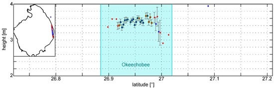 Water heights determined with the modified Improved Threshold Retracker (ITR) for a track crossing the Lake Okeechobee. Water heights of the class water are marked in blue, water heights of the class land-water transition are marked in red and the moving standard deviations of the water heights are displayed by the gray errorbars. Valid results after the outlier rejection are marked in green. The lake surface is indicated by the light blue area.