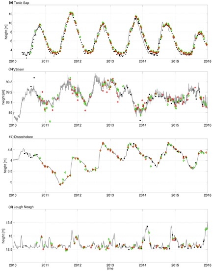 Water level time series solutions for the lakes (a) Tonle Sap; (b) Vättern; (c) Okeechobee; and (d) Lough Neagh: DGFI-TUM (red), gauging stations (gray), DAHITI (black) and DTU (green).